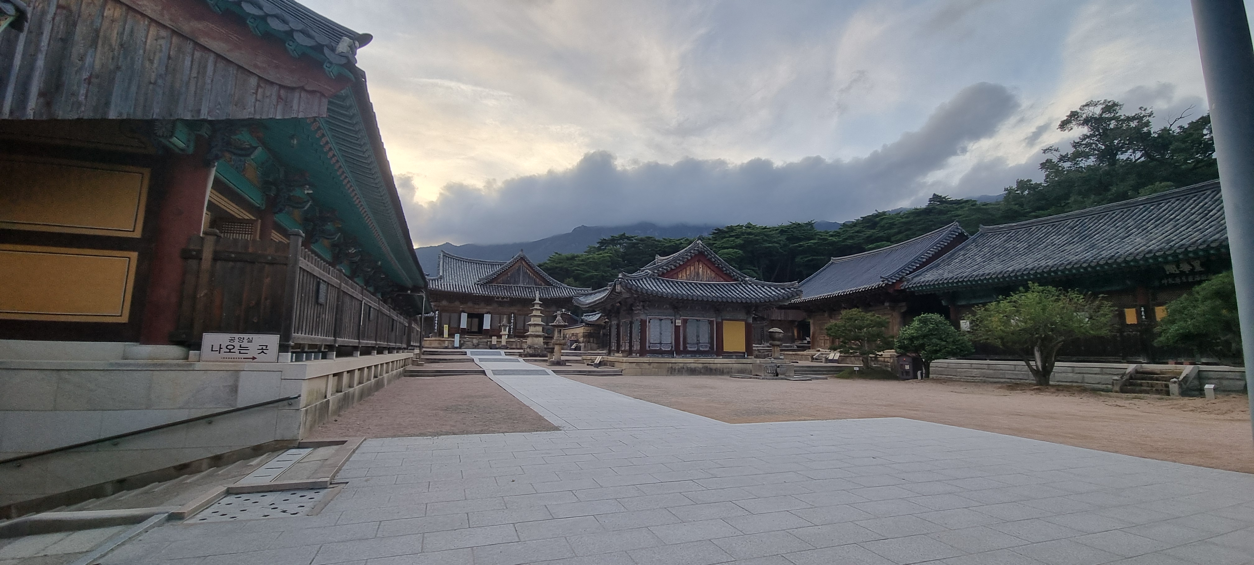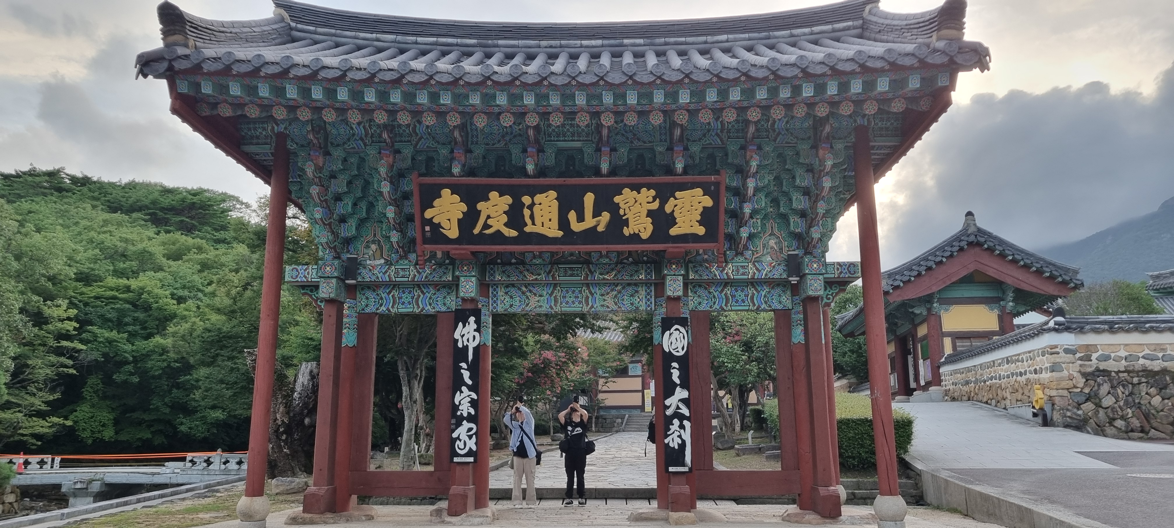 저녁 6시 30분, 하루를 마무리하며 통도사 절입구에서 대웅전까지 저녁 운동 삼아 걸었습니다. 길 양옆으로는 수백 년은 됐을 법한 아름다운 소나무들이 군락을 이루어 서 있고, 그 사이로 잘 다져진 황토길이 부드럽게 이어져 걷기에 참 좋았습니다.