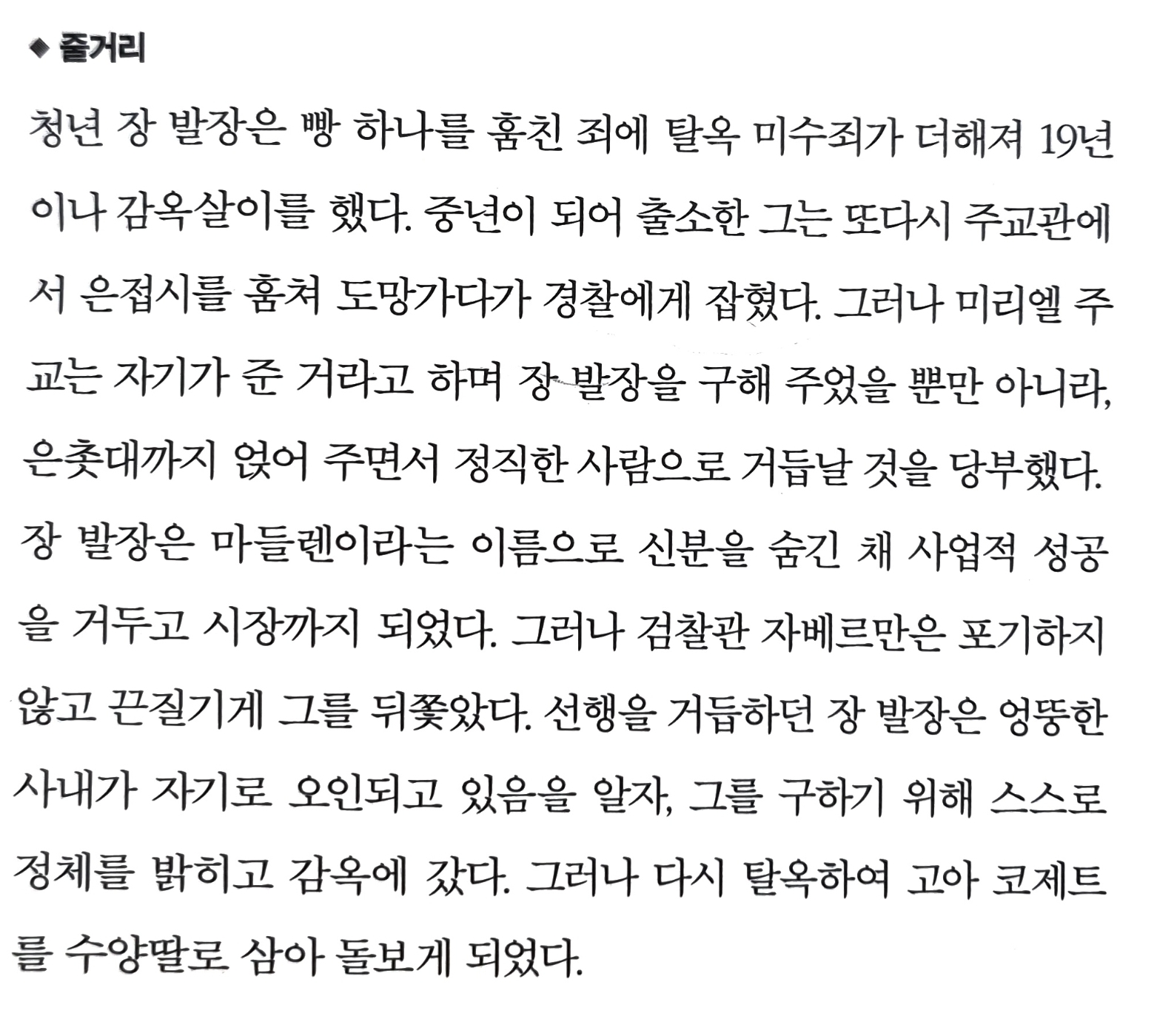 『레 미제라블』은 단순한 한 인물의 이야기를 넘어, 당시 사회의 불평등과 인간성의 문제를 깊이 있게 다룬 대작이다. 읽고 나서 ‘진정한 정의란 무엇인가?’, ‘사랑과 용서는 어떻게 사람을 변화시키는가?’라는 질문을 깊이 생각하게 된다.