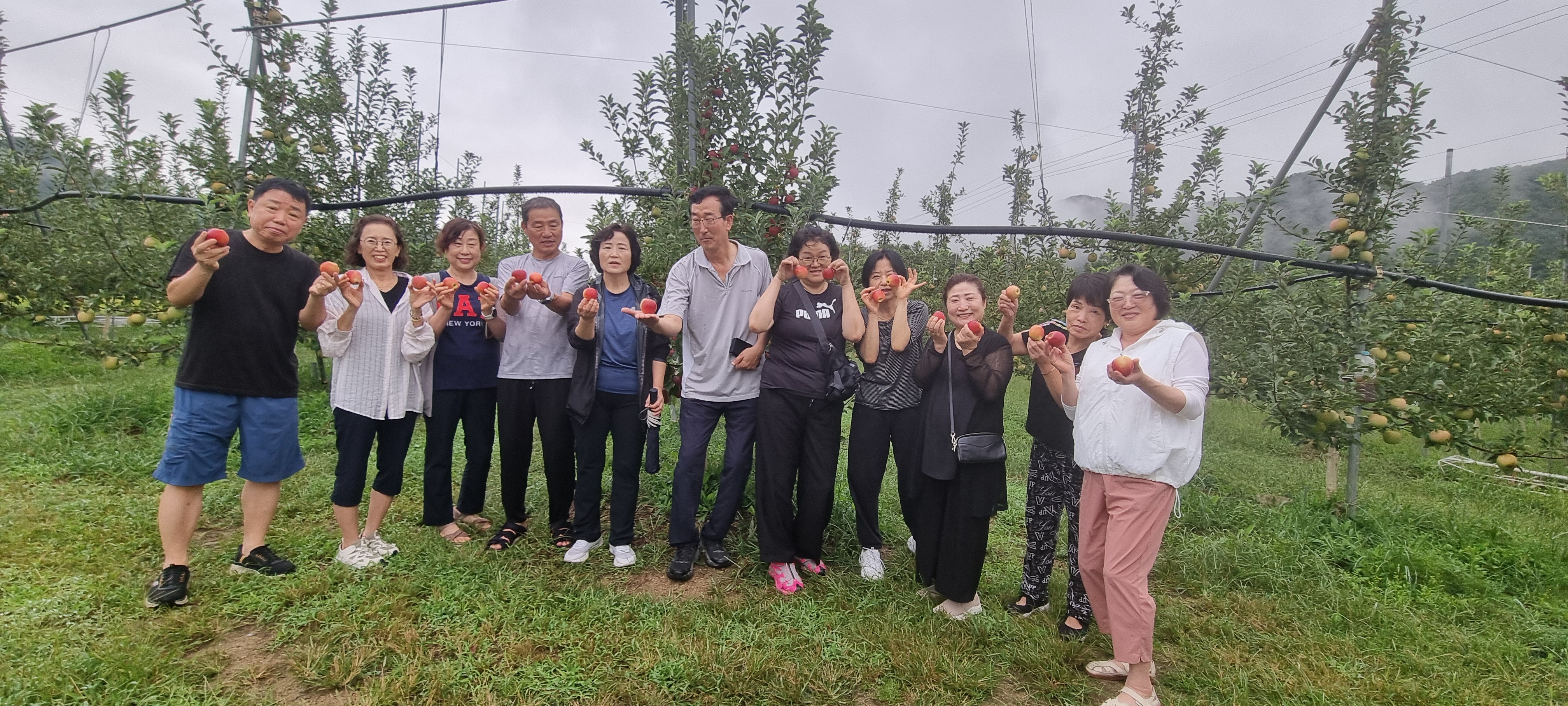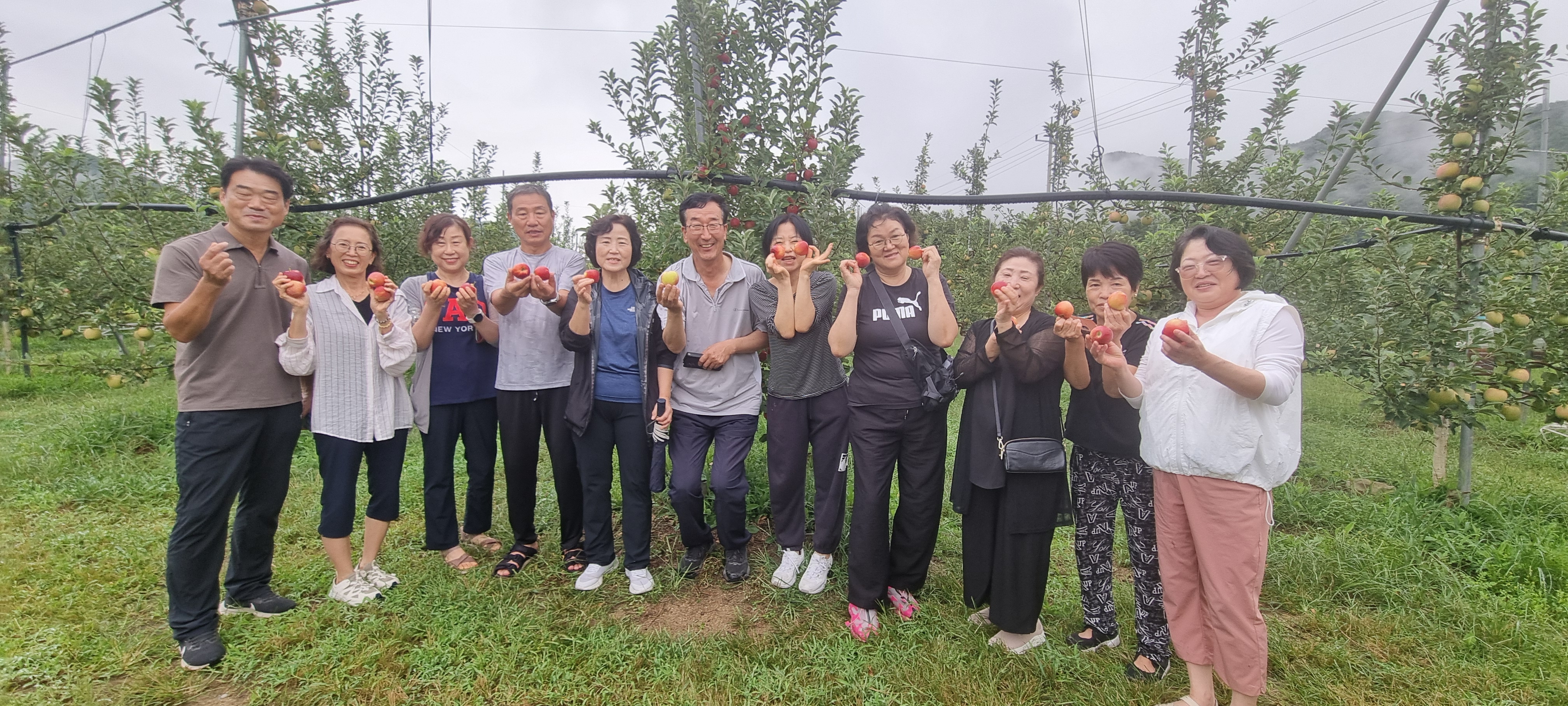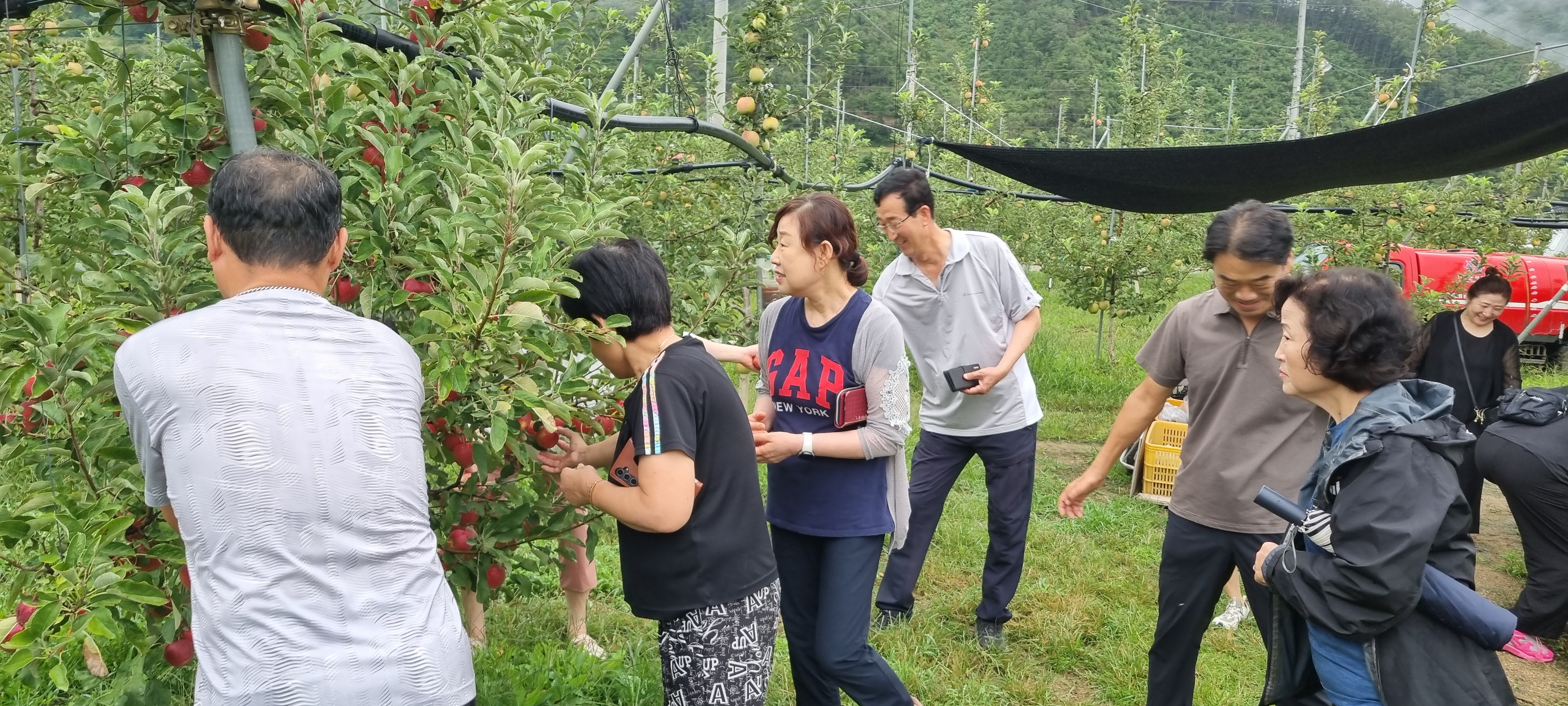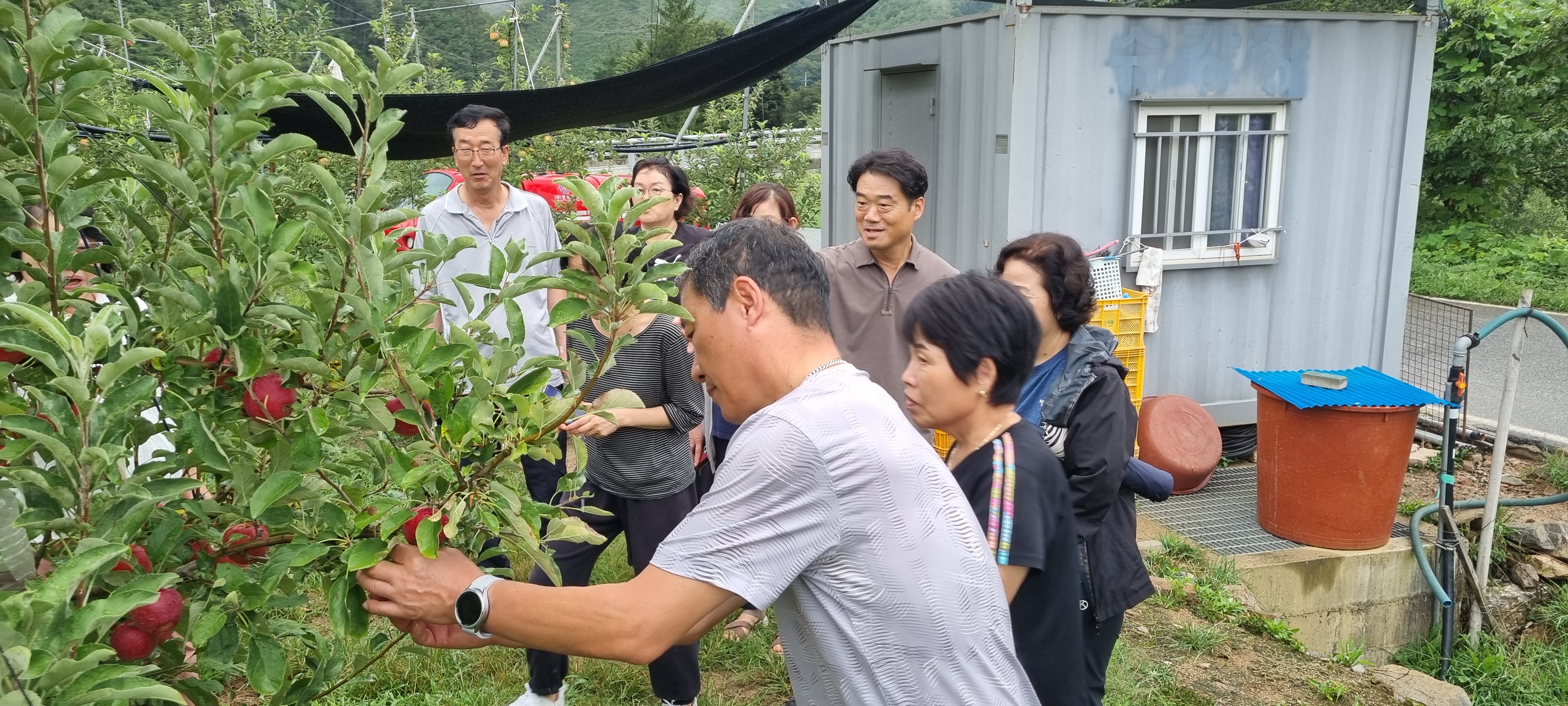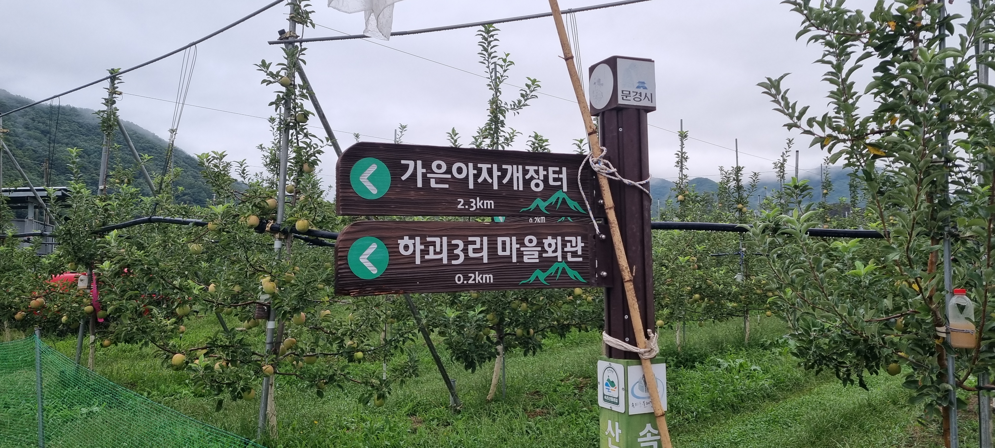 걷는 길 옆으로는 향어횟집이 보였고, 곧 상빈이 농장이 나타났습니다. 9월 중순, 감홍사과가 제맛을 더해가는 때라 곧 40일 뒤면 출하를 앞두고 있었습니다. 예약을 하지 않으면 맛보기 어려울 정도라니, 고향 농산물이 주는 자부심이 저절로 느껴졌습니다.