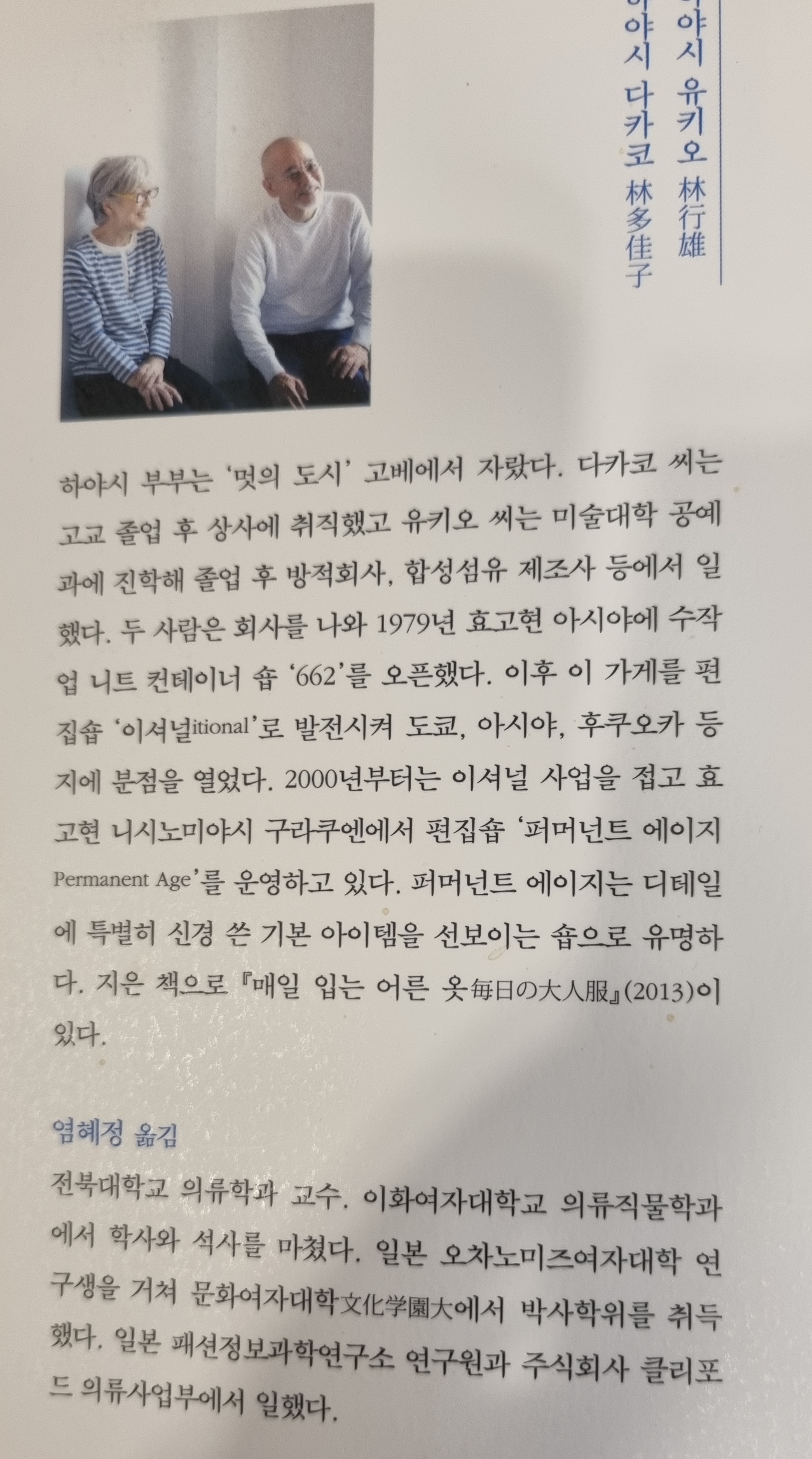 40년간 옷을 만들고 판매해 온 하야시 부부는 일본 ‘멋의 도시’ 고베에서 20대뿐만 아니라 70∼80대 노년층도 입을 수 있는 옷을 판매하는 편집숍 ‘퍼머넌트 에이지’를 운영 중이다. 유명 디자이너의 옷보다는 간편하게 입을 수 있는 티셔츠, 바지, 재킷, 가방과 모자 등이 가득하다. 하야시 부부는 “단순한 디자인인데, 얼마든지 멋스럽게 입을 수 있다”며 ‘일상복의 멋’을 부지런히 전파해 왔다. 서면과 전화로 진행한 인터뷰에서 이들은 “옷은 나를 돋보이게 해주는 동반자이자 근사하게 나이 들기 위한 시작”이라고 말했다. 그들이 말하는 근사하게 옷 입는 방법은 뭘까.