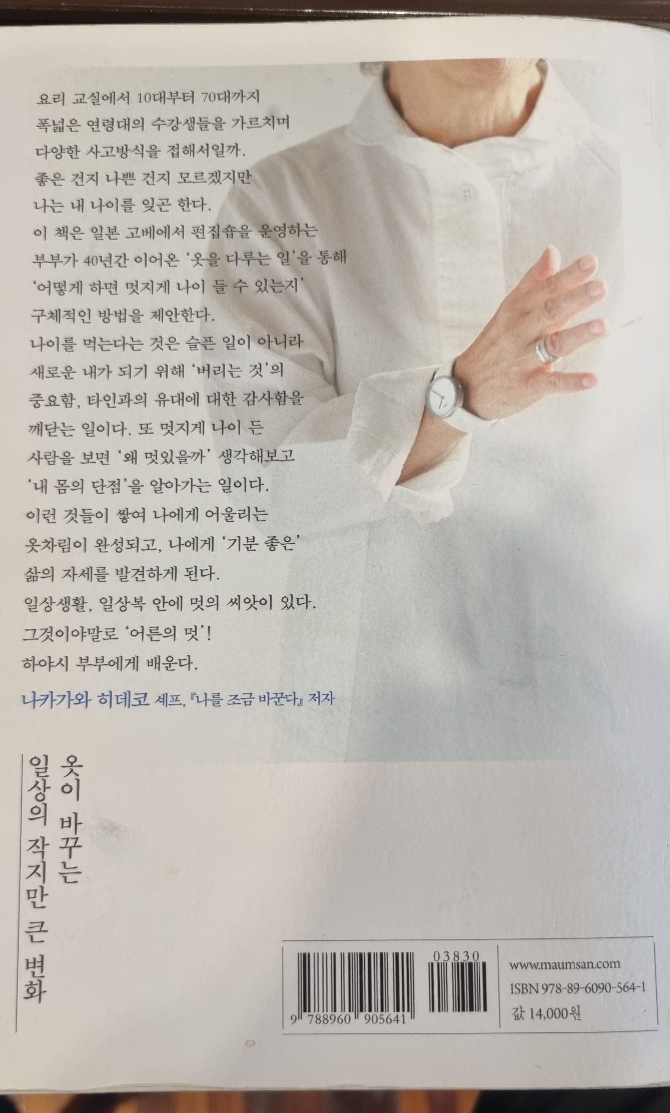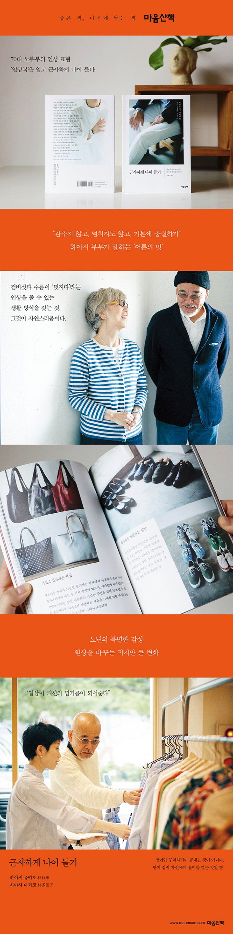 “젊었을 때 입던 옷이 안 어울려요.” 나이 들면서 자주 하는 말이다. 옷 치수가 맞지 않을뿐더러 색이나 디자인도 어쩐지 너무 과감해 보인다. 그러다 보니 다양한 시도를 하던 젊은 날과는 다르게 낙낙한 치수의 평범한 옷을 걸치게 된다. ‘계속 무미건조한 옷을 입어야 할까?’ 이런 고민에 빠진 어르신을 위한 패션 노하우를 담은 책 <근사하게 나이 들기>를 펴낸 일흔살 동갑내기 하야시 유키오·다카코 부부는 “나이 들었다고 멋에 관심을 두지 않으면 점점 우중충해진다”고 조언한다. 4년 전 이들이 낸 <근사하게 나이 들기>는 당시 일본에서 크게 주목받았다.