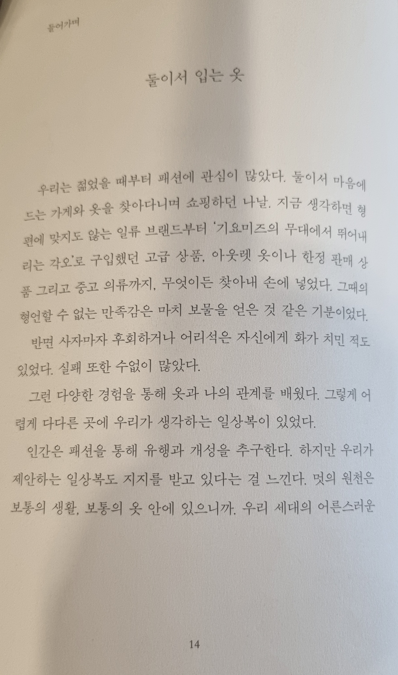 책을 읽으며 문득 주변의 몇 분이 떠올랐습니다. 저의 지인 한 분은 분리수거를 나갈 때조차 편한 슬리퍼 대신 단정한 복장과 신발을 신습니다. 또 다른 분은 등산과 마라톤을 즐기지만,항상 상하의 복장이 깔끔하고 색감이 살아 있으며,머리와 스카프 하나까지 세심하게 조화를 이룹니다. 한여름에도 생활 한복에 포인트 스카프를 매고 운동화까지 의복에 맞춰 신는 그 모습이 참인상적이 었습니다.