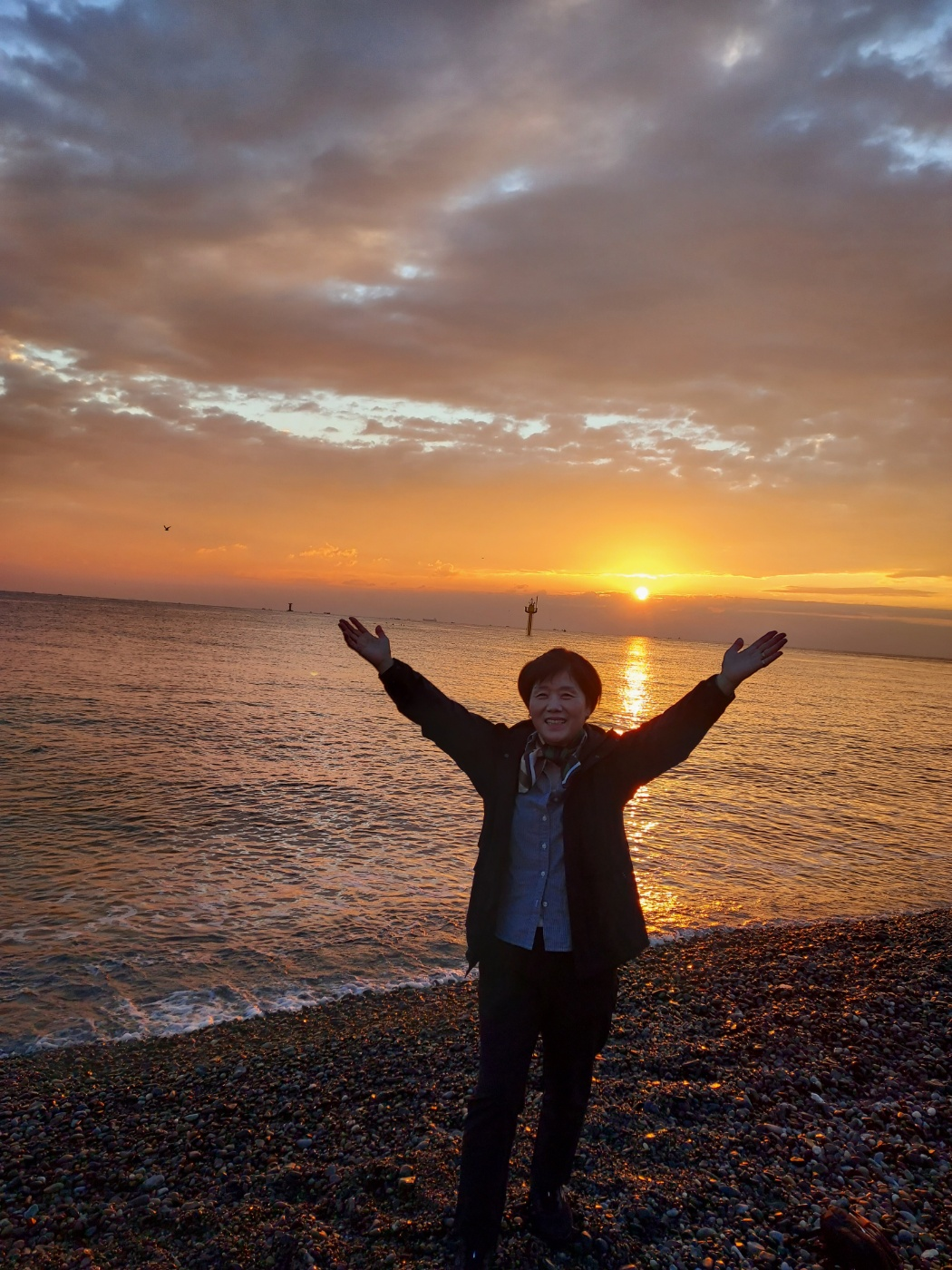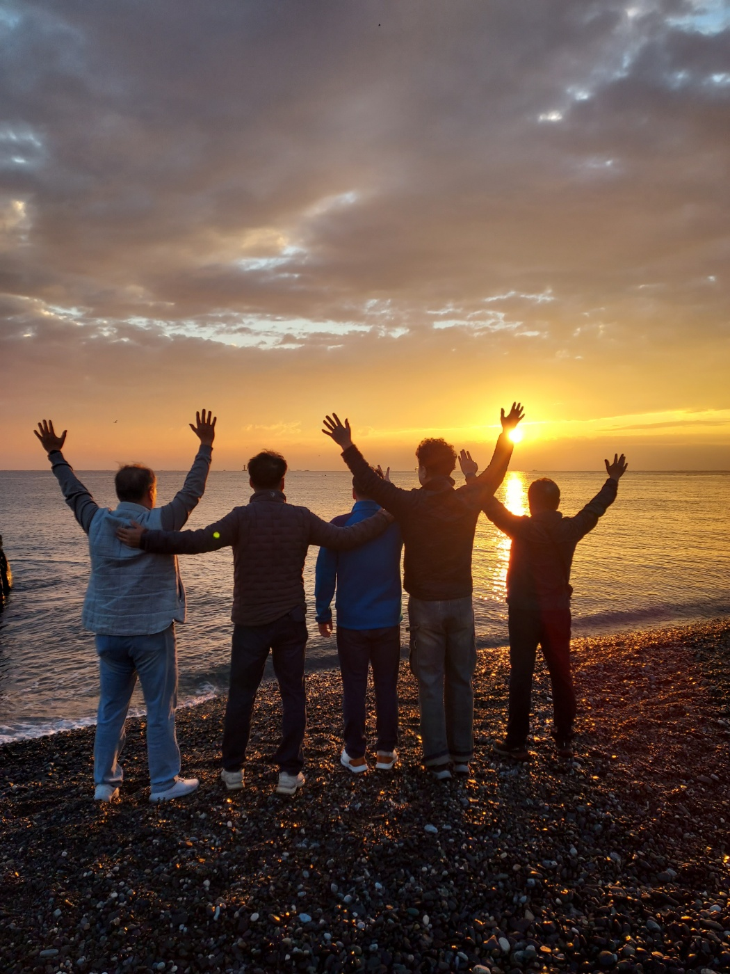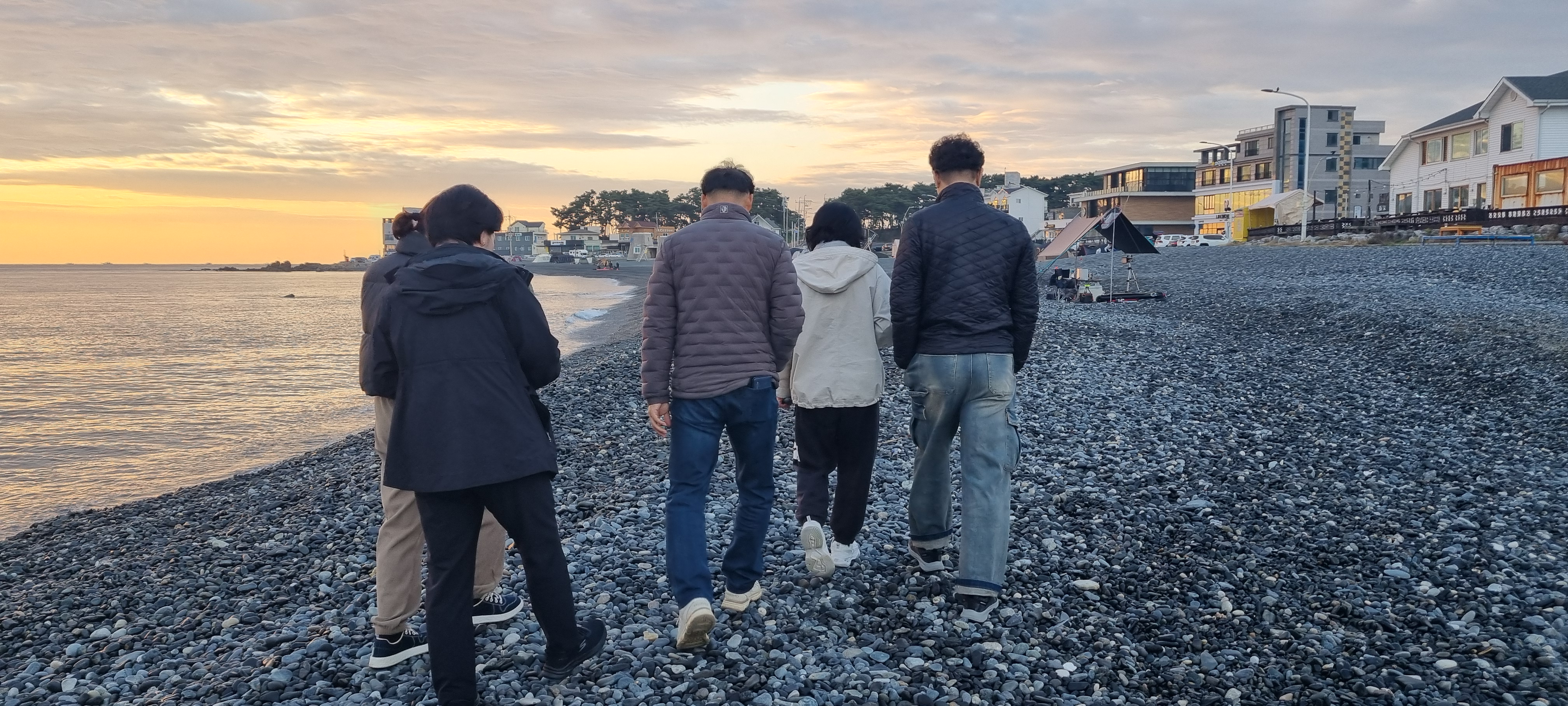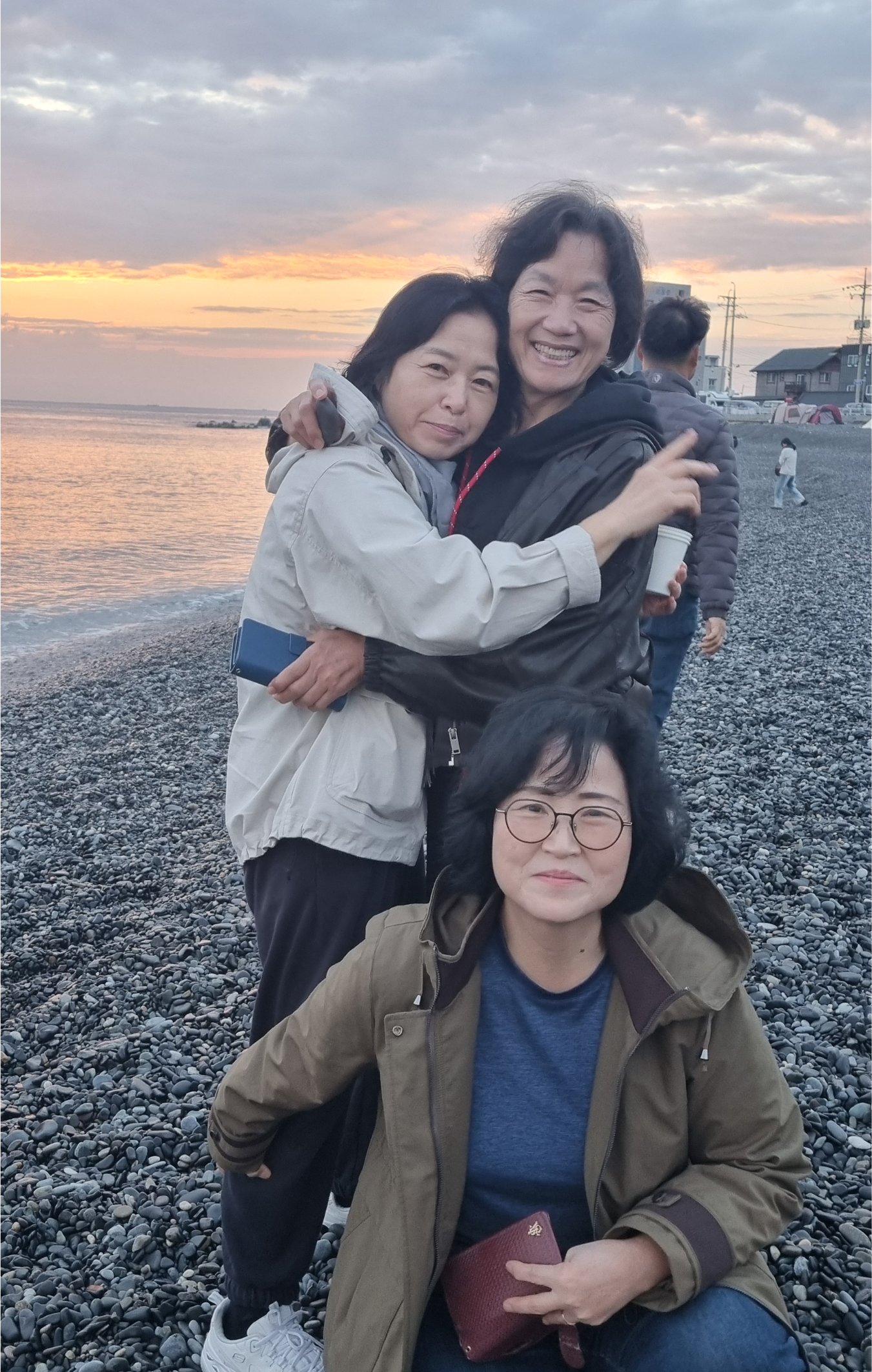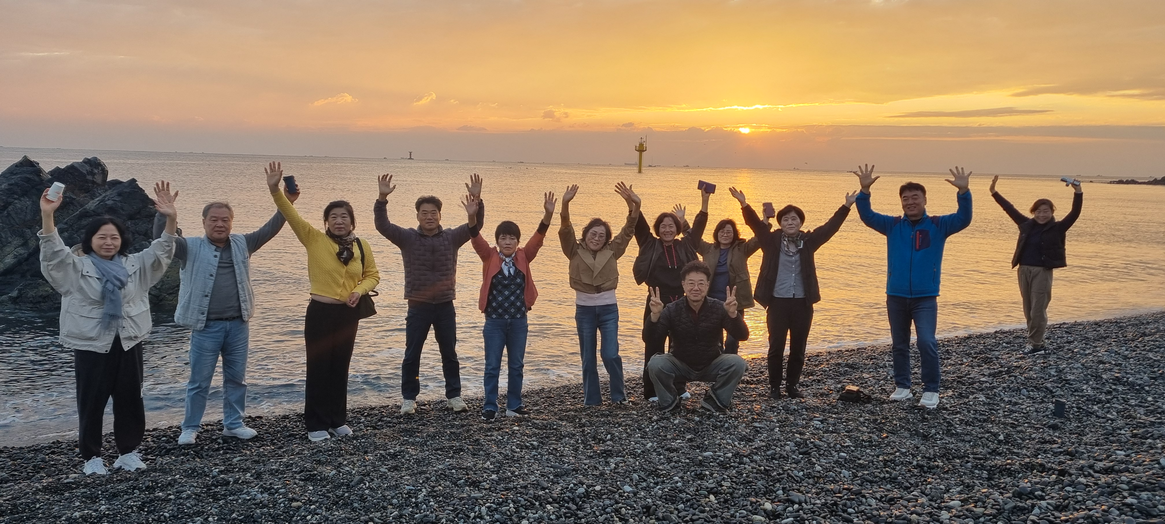해질녘, 숙소(宿所) 근처의 횟집에서 싱싱한 회 한 접시, 소주 한잔에 웃음이 넘쳤습니다. 바닷바람에 섞여 울려 퍼지는 친구들의 웃음소리 그것만으로도 여행의 이유는 충분했습니다. 다음 날, 우리는 새벽녘 몽돌공원 해변을 거닐었습니다. 동쪽 하늘이 붉게 물들고,드디어 첫 햇살이 바다 위로 솟아올랐습니다. 모두 두 손을 모아 소망을 빌고, 그 순간을 사진으로 남기며 “이 아침을 오래 기억하자”고 마음속으로 약속했습니다.