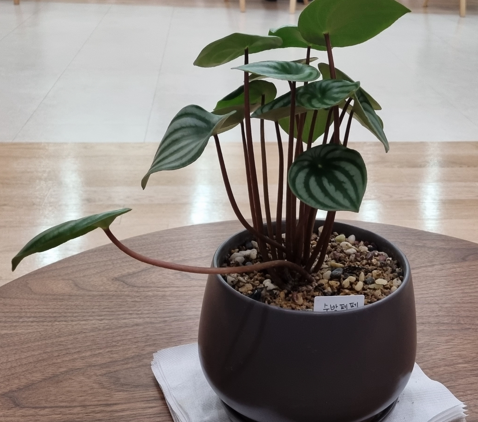 빛을 너무 바라지도 않고, 그늘을 두려워하지도 않는다.오히려 적당한 거리감 속에서 가장 빛난다. 그것이 레드스타의 품격이다.그 옆에, 작은 둥근 잎들이 오밀조밀 모여 있는 식물 하나. 수박처럼 잎맥이 은빛으로 번져 ‘수박페페’라 불리는 귀여운 생명이다. 짙은 녹색 잎 위로 은빛 무늬가 번지는 모습은 거실의 단조로움을 부드럽게 감싸준다. 페페로미아 아르지레아(Peperomia argyreia),즉 수 박페페는 습도와 온기를 좋아하는 다정한 식물이다.
