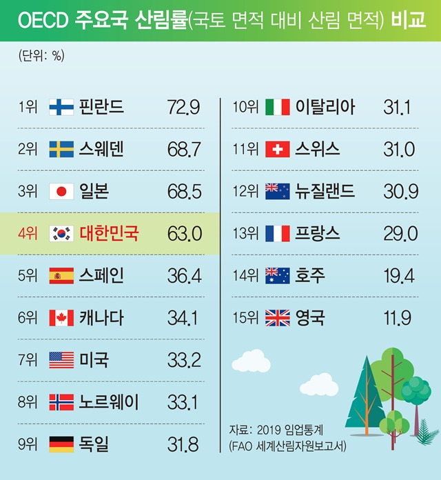 1967년 산림청을 발족하고 1973년 제1차 치산녹화 10개년 계획을 수립하면서 본격화한 산림녹화는 불과 반세기 만에 한국은 산림률(국토 면적 대비 산림 면적)이 경제협력개발기구(OECD) 국가 중 핀란드, 스웨덴, 일본 다음으로 세계 4대 산림 강국이 됐다. 이제 우리나라는 인도네시아, 몽골, 미얀마 등 20여 개국의 산림녹화를 지원하는 공적원조 제공국가이기도 하다.