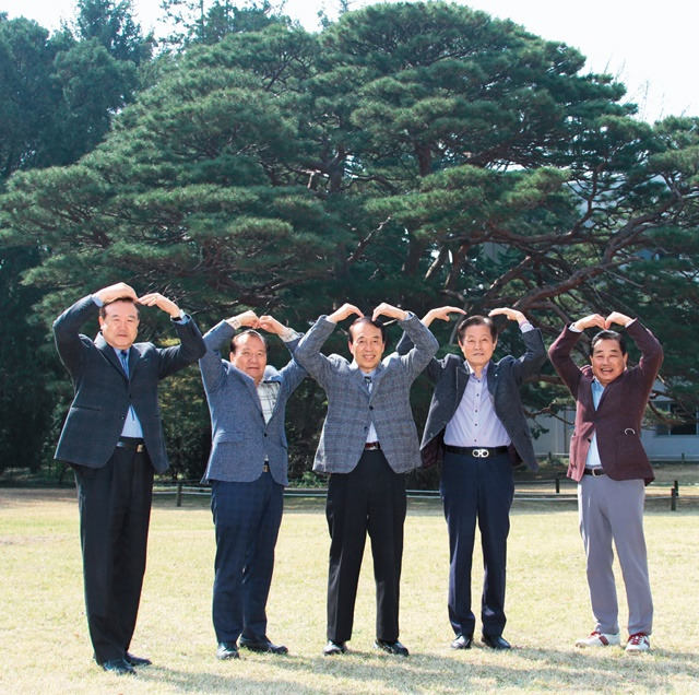 서울 동대문구 회기로 국립산림과학원 안에 있는, 홍릉숲 최장수 나무이자 산증인인 1892년생 반송 앞에서 산림녹화UNESCO등재추진위원회 이경준 위원장(가운데)과 본부장들이 등재추진을 위한 결의를 다지고 있다